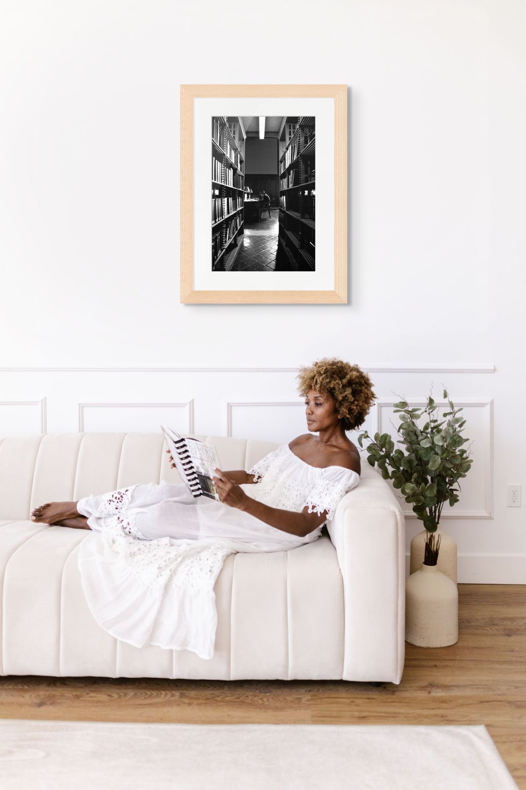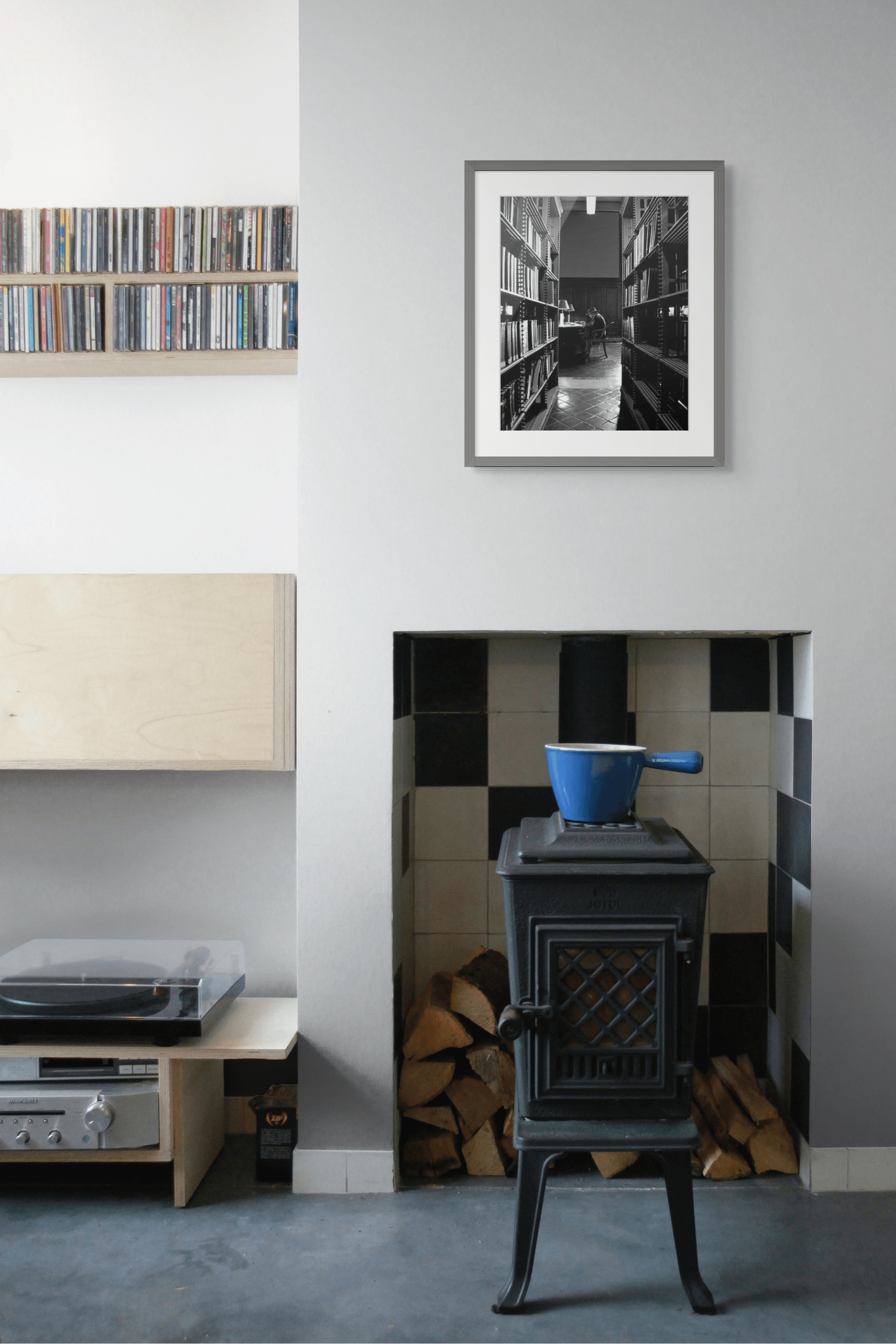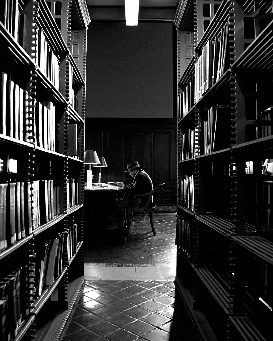 Tra gli scaffali si scorge una figura intenta a sfogliare un libro con un’espressione non troppo convinta di quello che ha trovato mentre la luce della lampada si riflette sulle pagine e illumina il suo viso.